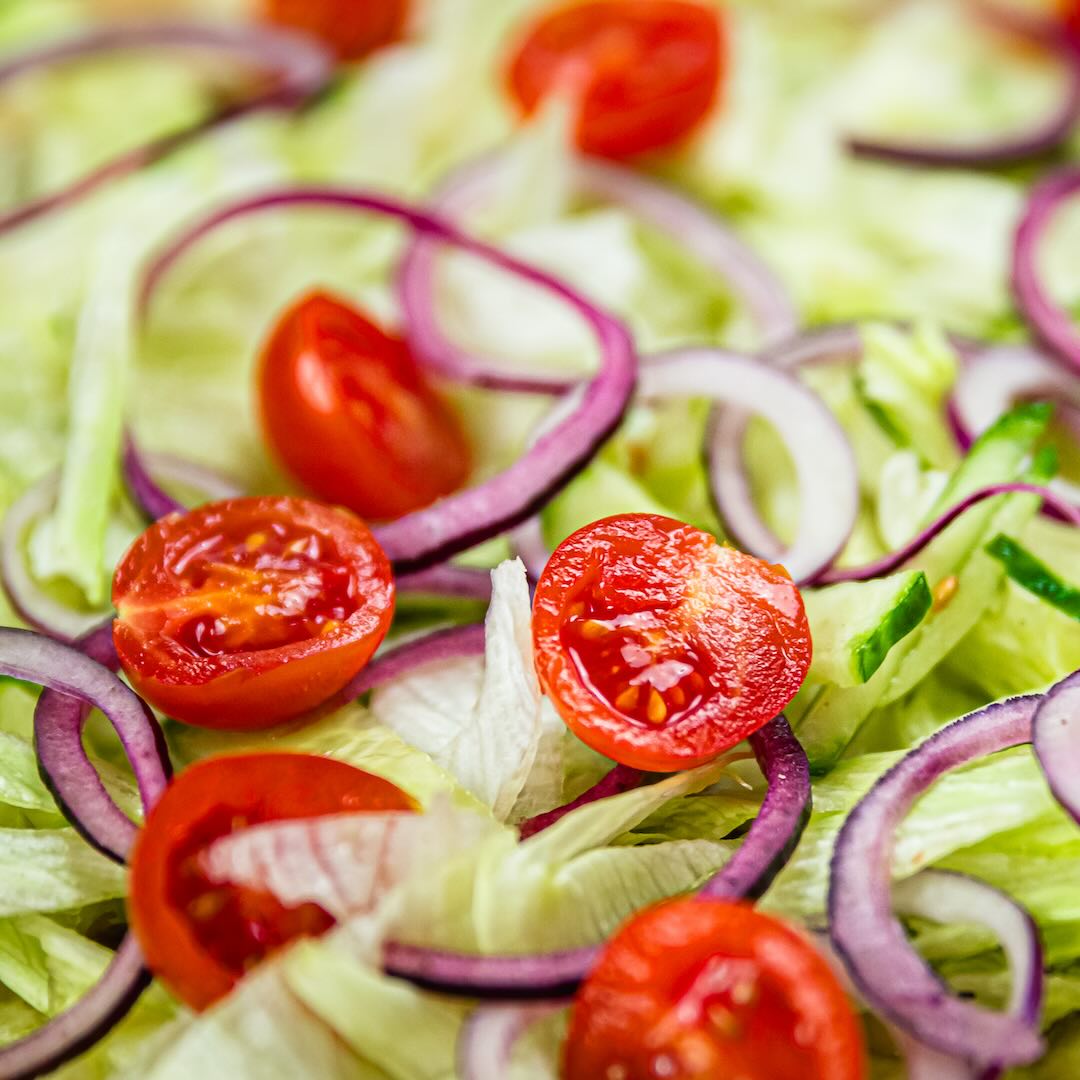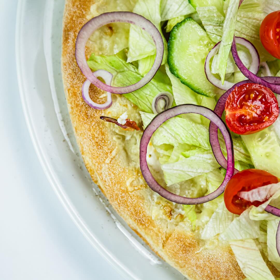 Kézzel nyújtott pizza tészta, Fokhagymás tejfölös alap, gyros hús, sajt, paradicsom, lila hagyma, feta sajt, uborka, jégsaláta.