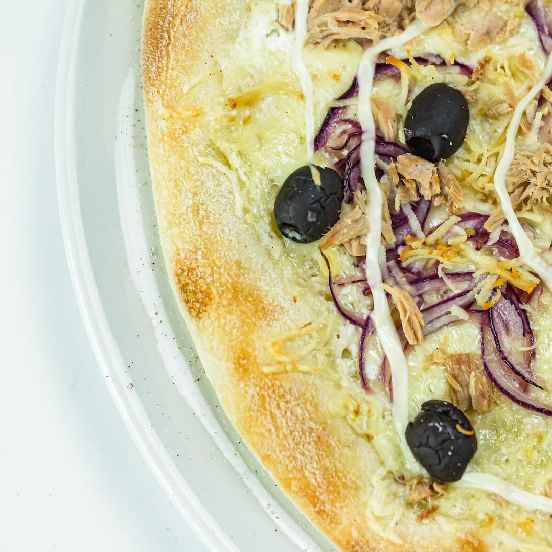Kézzel nyújtott pizza tészta, fokhagymás tejfölös alap, tonhal, lila hagyma, sajtkrém, fekete oliva, füst sajt, trappista sajt.